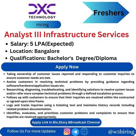 In conclusion, the Analyst II Infrastructure Services role at DXC Technology is a multifaceted and crucial position for anyone passionate about the intricate world of IT infrastructure. It offers a dynamic blend of technical challenges, problem-solving opportunities, and the chance to contribute significantly to the operational success of both DXC and its clients. With a strong focus on skill development, career progression, and working within a global leader in IT services, this role is an excellent choice for individuals looking to build a solid foundation and grow within the technology sector. Keep learning, stay curious, and embrace the challenges – the world of infrastructure services awaits!