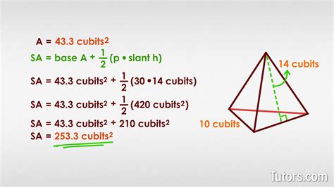 Here, ‘base of the triangle’ refers to one of the sides of the triangular base, and ‘height of the triangle’ is the perpendicular distance from the opposite vertex to that chosen base. It’s important not to confuse this ‘height of the triangle’ with the ‘height of the pyramid’ we talked about earlier. They are different measurements! For example, if your triangular base has sides measuring 5 cm, 8 cm, and 10 cm, you might need to use Heron’s formula if you don’t have a clear base and perpendicular height. Heron’s formula requires you to first find the semi-perimeter (s) of the triangle: \(s = \frac{(a+b+c)}{2}\) , where a, b, and c are the lengths of the sides. Then, the area is \(\sqrt{s(s-a)(s-b)(s-c)}\) . Or, if you’re given two sides and the angle between them, you can use Area = \(\frac{1}{2}ab ext{sin}(C)\) . The key is to correctly identify or calculate the area of that specific triangular base.