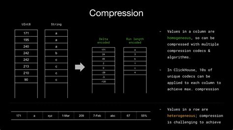 At its core, ClickHouse employs a variety of compression algorithms to reduce the storage footprint of your data. This not only saves disk space but also significantly improves query performance by reducing the amount of data that needs to be read from disk. Think of it like this: instead of hauling a truckload of bricks, you’re only carrying a neatly compressed package – much faster, right?