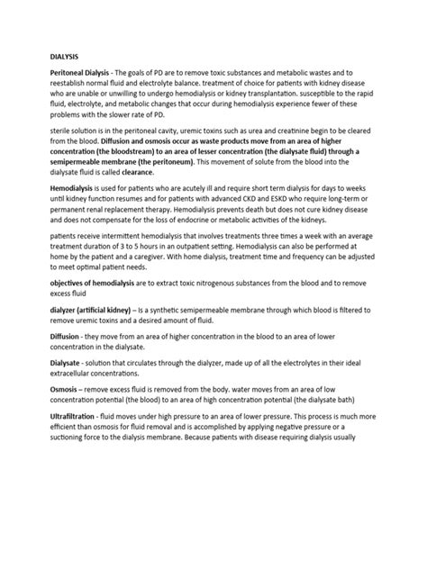 Peritoneal Dialysis: This type uses the lining of your abdomen (peritoneum) as a natural filter. A special fluid (dialysate) is introduced into your abdominal cavity, where it absorbs waste and excess fluid from your blood. After a few hours, the fluid is drained out, taking the waste with it. Peritoneal dialysis can be done at home, giving you more flexibility in your treatment schedule. However, it requires careful training and adherence to strict hygiene protocols to prevent infection.