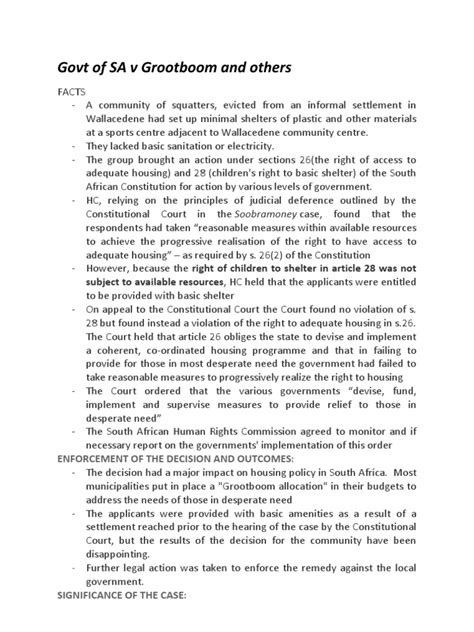 Hey guys, let’s dive into the background of the Grootboom case . This pivotal case emerged from the dire circumstances faced by Irene Grootboom and a large group of individuals residing in an informal settlement called Wallacedene, near Cape Town. These people were living in extreme poverty, with inadequate access to basic services such as water, sanitation, and healthcare. Frustrated by the lack of government assistance and the failure to provide suitable housing, they decided to take matters into their own hands. In May 2000, the community members, including Grootboom, occupied vacant land that was earmarked for low-cost housing development. However, their occupation was short-lived. They were forcibly evicted from the land by the local authorities, and their makeshift shelters were demolished. With nowhere else to go, they were left homeless and destitute, exposed to the elements and further entrenched in poverty. In response to their plight, Grootboom and other members of the community sought legal recourse, arguing that the government’s failure to provide them with adequate housing violated their constitutional rights. They contended that the state had a constitutional obligation to provide them with access to housing, or at least basic shelter, given their desperate circumstances. Their case eventually made its way to the Constitutional Court of South Africa, which is the highest court in the country and the ultimate interpreter of the Constitution. The Constitutional Court agreed to hear the case, recognizing its significance for the interpretation and application of socio-economic rights in South Africa. The legal arguments presented before the Court centered on the interpretation of Section 26 of the Constitution, which deals with the right to access adequate housing. The section states that everyone has the right to have access to adequate housing, and that the state must take reasonable legislative and other measures, within its available resources, to achieve the progressive realization of this right. The Grootboom case thus provided the Constitutional Court with an opportunity to clarify the scope and content of this right, and to define the obligations of the state in relation to its fulfillment. The background of the case is a stark reminder of the socio-economic challenges facing many South Africans, and the importance of upholding constitutional rights to ensure that everyone has access to basic necessities and a life of dignity. It underscores the critical role of the judiciary in holding the government accountable and ensuring that the rights of the most vulnerable members of society are protected.