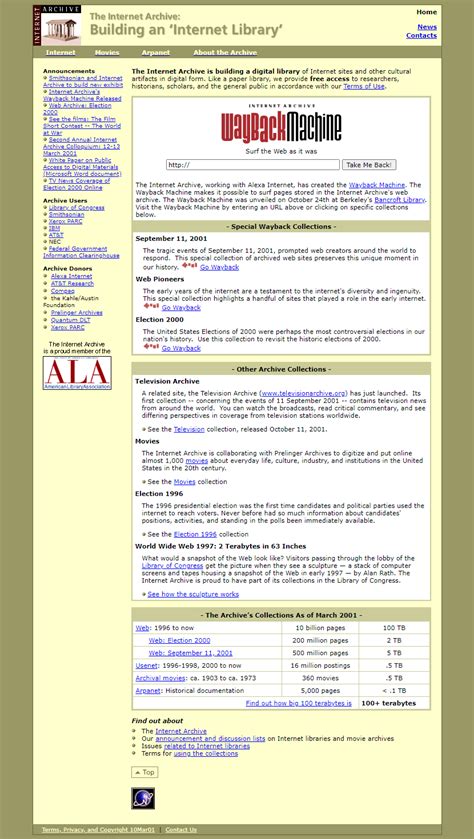 The Wayback Machine is the Internet Archive’s most famous tool, and it’s what we’ll use to explore what the Internet Archive looked like in 2001. The Wayback Machine is essentially a digital archive of the World Wide Web. It works by crawling the web and taking snapshots of websites at various points in time. These snapshots are then indexed and made available to the public, allowing users to see how a website looked on a specific date. It’s like having a time machine for the internet! Using the Wayback Machine is super simple. Just head over to the Internet Archive website, enter the URL you want to explore (in this case, the Internet Archive’s own URL), and select a date from the calendar. Voila! You’ll be transported back in time to see what the website looked like on that particular day. The Wayback Machine is incredibly useful for researchers, historians, and anyone curious about the history of the internet. It allows us to track changes in website design, content, and functionality over time. This is especially valuable for understanding how the internet has evolved and how different websites have adapted to changing technologies and user expectations. The Wayback Machine also serves as an important tool for preserving digital history, ensuring that valuable information and cultural artifacts are not lost to time. Imagine trying to research a historical event or track the evolution of a particular technology without access to archived websites. The Wayback Machine makes this possible, providing a wealth of information for researchers and historians alike.