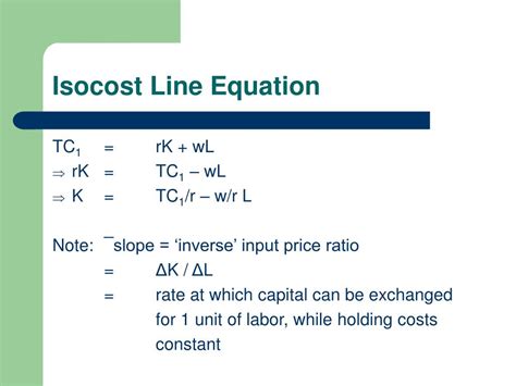 The isocost equation is a fundamental tool in managerial economics that helps firms make informed decisions about resource allocation. By understanding the relationship between input costs and total cost, managers can optimize their production processes and minimize expenses. The equation is particularly useful when a firm faces a budget constraint and needs to determine the most efficient combination of labor and capital to achieve a specific level of output. Moreover, the isocost equation can be used to analyze the impact of changes in input prices on the firm’s cost structure. For example, if the price of labor increases, the firm can use the isocost equation to determine how much capital it needs to substitute for labor in order to maintain the same total cost. The isocost equation is also closely related to the concept of isoquants, which represent the different combinations of inputs that can produce a given level of output. By combining the isocost equation with isoquant analysis, firms can identify the least-cost combination of inputs for producing a specific level of output, thereby maximizing their profits. The equation provides a framework for evaluating different production scenarios and making strategic decisions about resource allocation.