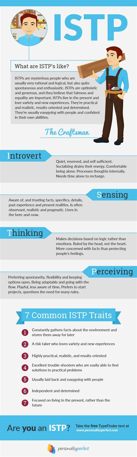 Hey guys, let’s dive deep into the fascinating world of the ISTP personality type, often referred to as the Craftsman . If you’re an ISTP, or know one, you’ll probably recognize a lot of what we’re about to cover. These individuals are the quiet observers, the masters of their craft, and the go-to problem solvers. They’re often seen as adaptable, pragmatic, and incredibly hands-on. Think of mechanics, engineers, surgeons, pilots – people who excel when they can work with their hands, understand how things work, and fix them when they break. Understanding the ISTP is key to appreciating their unique approach to life, work, and relationships. They thrive in environments where they have autonomy, can experiment, and see immediate results from their efforts. Their introverted nature means they often process information internally, and their sensing function allows them to focus on the concrete realities of the present moment. This combination makes them exceptionally good at dealing with the tangible world around them. They’re not typically ones for long-term abstract planning; rather, they prefer to tackle issues as they arise, using their keen observation skills and logical thinking to find the most efficient solution. This can sometimes make them appear spontaneous or even impulsive to others, but for the ISTP, it’s often a calculated response to a situation. They live in the ‘here and now,’ constantly gathering information and ready to act when the time is right. Their thinking preference means they approach decisions logically and objectively, free from emotional bias, which is a superpower when it comes to troubleshooting and critical thinking. They value efficiency and directness, and can get frustrated with overly complex or bureaucratic processes. The ISTP’s dominant function, Introverted Thinking (Ti), is all about internal logic and precision. They build elaborate mental frameworks to understand how things work, seeking accuracy and consistency. This is paired with Extraverted Sensing (Se), which allows them to be highly aware of their immediate environment and engage with the physical world in a direct, hands-on way. It’s this dynamic duo that makes them such formidable problem-solvers and skilled practitioners in their chosen fields. They are the ultimate doers, preferring action over idle talk, and often learn best by doing rather than by reading or listening. When an ISTP is engaged in an activity they’re passionate about, they can enter a state of flow, becoming completely absorbed and demonstrating remarkable focus and skill. Their quiet confidence and independent spirit make them valuable team members, though they often prefer to work alone or in small, focused groups. They respect competence and directness, and are generally unfazed by pressure. This personality type is a fascinating blend of practicality, logic, and a desire for action, making them indispensable in many walks of life.