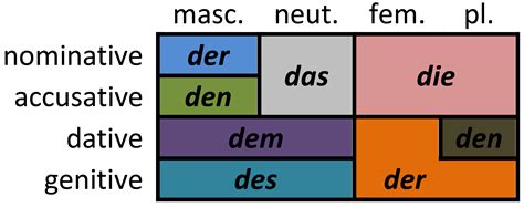 | Case | Masculine | Feminine | Neuter | Plural | | :———- | :——– | :——- | :——- | :—– | | Nominative | der | die | das | die | | Accusative | den | die | das | die | | Dative | dem | der | dem | den | | Genitive | des | der | des | der |