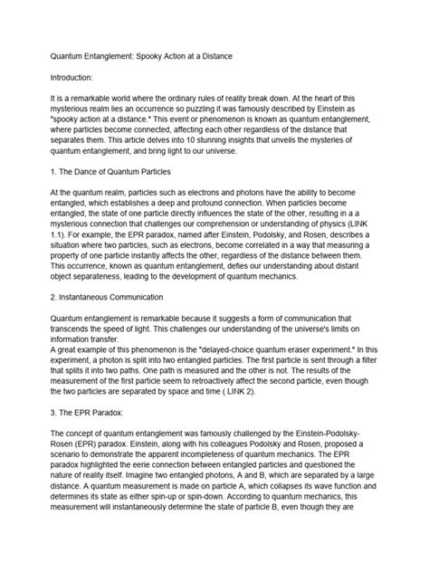 Okay, so what exactly is going on here? When particles are entangled, their properties – such as spin or polarization – become correlated. This means that if you measure the spin of one particle, you instantly know the spin of the other, even if they are light-years away. This instantaneous connection is what spooked Einstein because it seemed to violate the principle that nothing can travel faster than light. The entanglement happens when these particles interact in a specific way, such as being created together or passing close to each other. This interaction links their quantum states, creating a single, unified quantum system. It’s like they have a secret agreement on how to behave, regardless of the distance separating them. This shared quantum state is described by a single wave function, which means you can’t describe the properties of one particle without considering the other. Understanding the implications of entanglement requires delving into the fundamentals of quantum mechanics, where particles can exist in multiple states simultaneously (a concept known as superposition) until measured. When a measurement is made, the entangled particles’ properties become definite and correlated instantly, no matter the distance. This is the core of the “spooky action,” as the measurement of one particle instantaneously influences the state of the other.