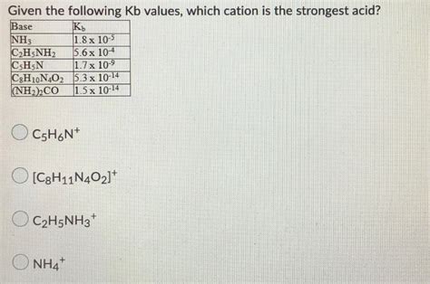 So, there you have it, folks! When faced with the question of which of the following KB values represents the strongest base , the answer is simple: it’s the one with the largest KB value. Remember, a higher KB means greater dissociation in water, leading to a higher concentration of hydroxide ions and thus, a stronger base. If you’re given pKB values, just flip that around: the smallest pKB value indicates the strongest base. It’s a fundamental concept in chemistry that helps us predict and understand the behavior of solutions. Keep practicing with different examples, and you’ll be a base-strength-identifying pro in no time! Happy studying, everyone!