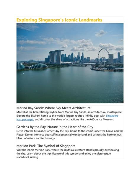 Singapore’s iconic landmarks are more than just sights; they’re testaments to the country’s rich history, innovative spirit, and commitment to sustainability. From the futuristic Supertree Grove to the historic streets of Chinatown, each landmark tells a unique story. Firstly, let’s talk about the awe-inspiring Gardens by the Bay . These sprawling gardens are a testament to Singapore’s dedication to green spaces. The Supertree Grove, with its towering, tree-like structures, is the centerpiece. These vertical gardens aren’t just for show; they also collect rainwater and generate solar power. Wandering through the Cloud Forest and Flower Dome conservatories is an absolute must. These cooled conservatories house diverse plant life from around the world, creating a surreal and unforgettable experience. The Gardens by the Bay is a perfect example of how Singapore tourism seamlessly blends nature and technology. Next up, we have the iconic Marina Bay Sands . This integrated resort is renowned for its stunning architecture, featuring three towers connected by the SkyPark. The SkyPark offers breathtaking panoramic views of the city skyline, making it a perfect spot for photography enthusiasts. The infinity pool atop the SkyPark is another highlight, offering a unique swimming experience with unparalleled views. Besides, Marina Bay Sands houses a luxury hotel, a casino, and a shopping mall, ensuring that visitors have a variety of entertainment options. Going further, let’s explore Chinatown . This historic district offers a glimpse into Singapore’s rich Chinese heritage. The vibrant streets are lined with traditional shophouses, bustling markets, and temples. Exploring Chinatown is a treat for the senses, with the aroma of delicious street food filling the air. You can visit the Buddha Tooth Relic Temple and Museum, a stunning temple housing a sacred relic. Chinatown also boasts a variety of shops selling traditional crafts, souvenirs, and herbal remedies. It’s a great place to immerse yourself in the local culture and experience the true essence of Singapore’s heritage . Last but not least, we must not forget about Merlion Park . The Merlion, a mythical creature with the head of a lion and the body of a fish, is a national icon. The Merlion statue at Merlion Park offers a fantastic photo opportunity with the city skyline as a backdrop. This park is a popular spot for both locals and tourists, offering scenic views and a relaxing atmosphere. The park is often bustling with activity, particularly during sunset, when the city lights begin to twinkle. Visiting these iconic landmarks will provide you with a well-rounded perspective of Singapore. They capture the essence of Singapore’s past, present, and future, showcasing its diverse cultural tapestry, innovative architecture, and commitment to providing memorable experiences for visitors. From exploring the futuristic Gardens by the Bay to immersing yourself in the historic streets of Chinatown, Singapore offers something for everyone, making it a must-visit destination.